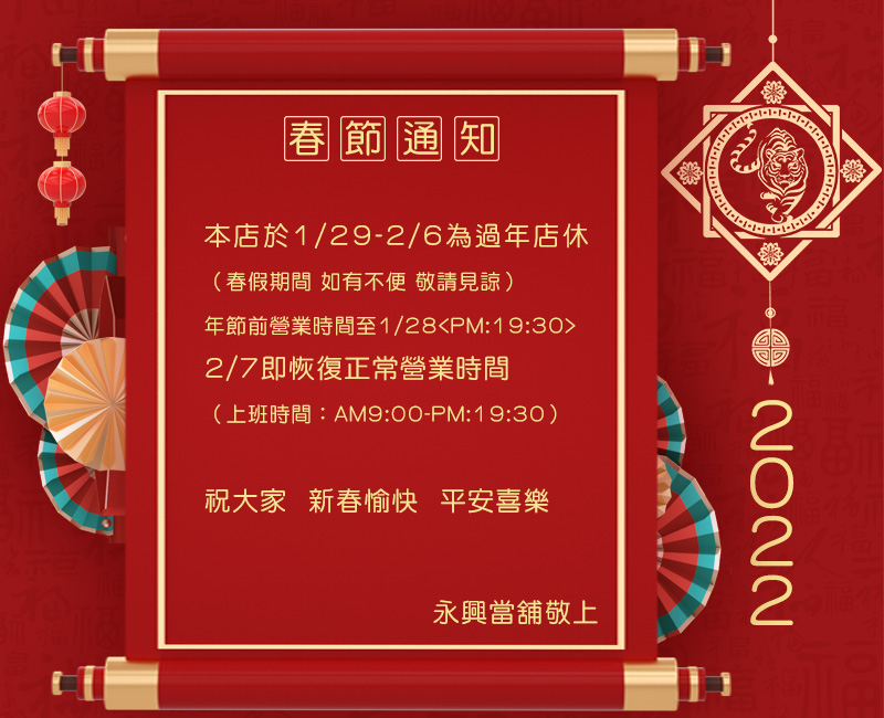 您的位置:新竹永興當舖 > 最新消息『公告』2022年01月29日(六)~02月06日(日)春節